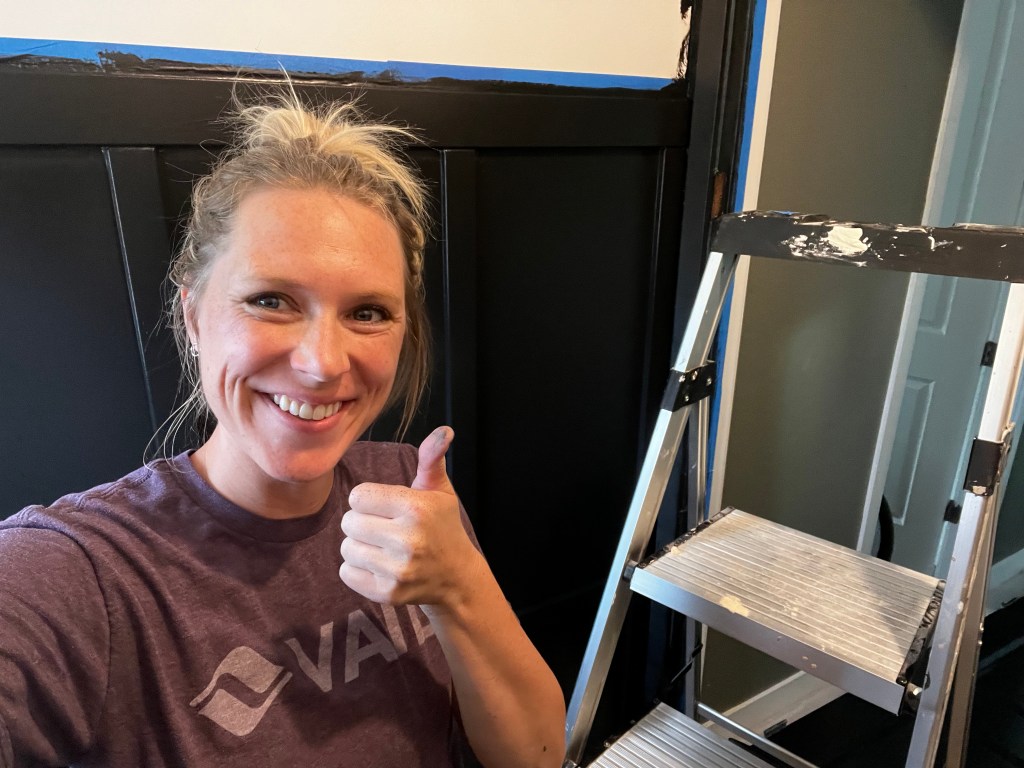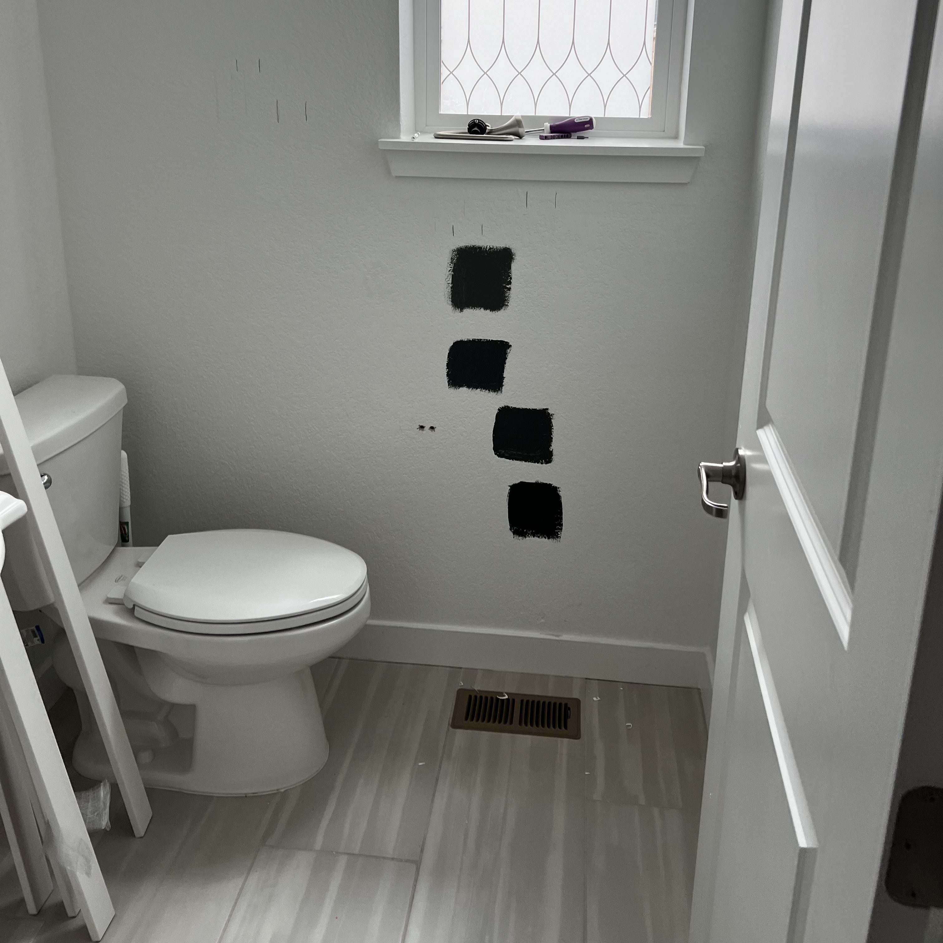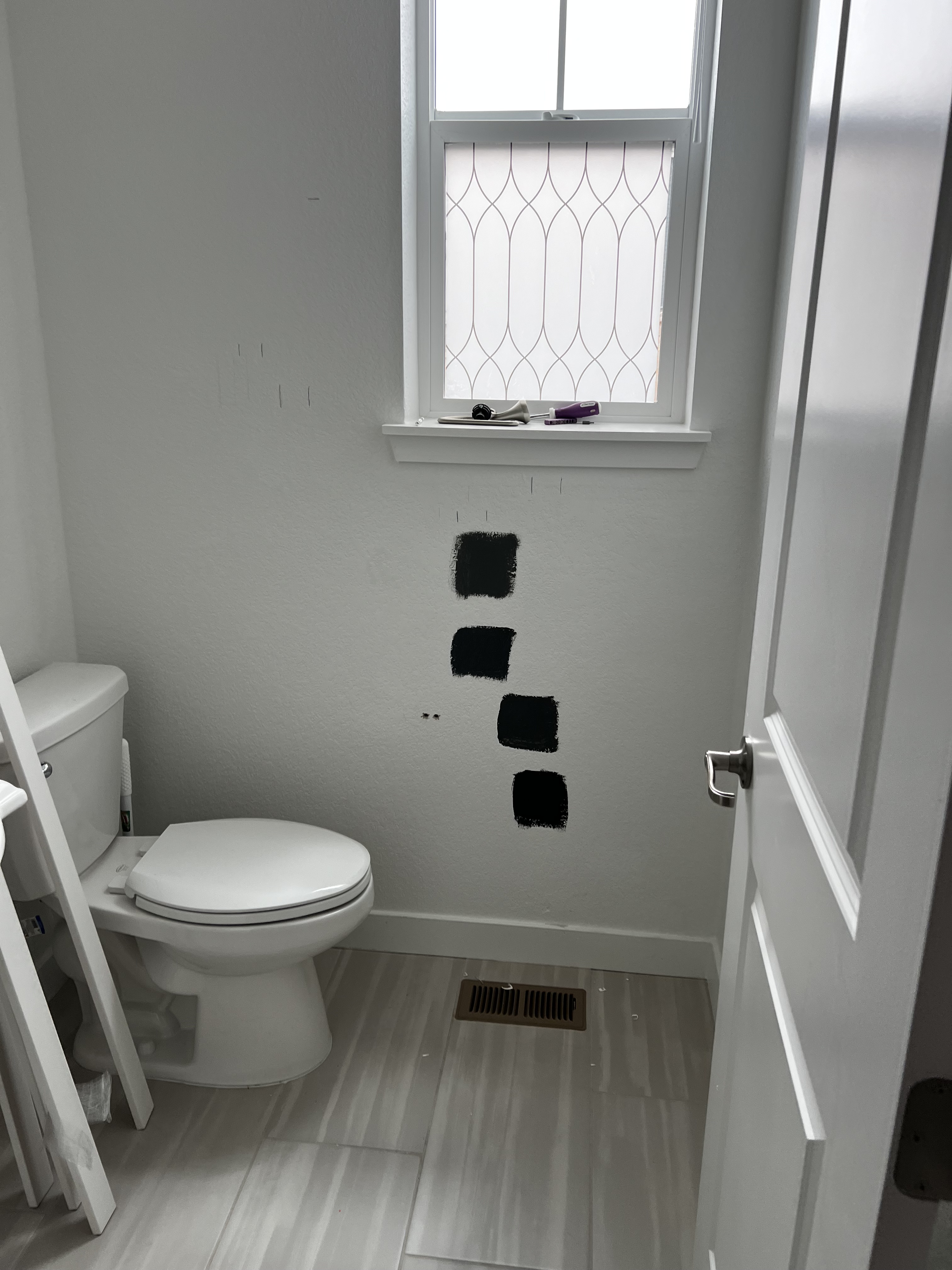 Painted the lower half “fade to black” satin paint and then did the upper half and ceiling in the “fade to black” roman clay.