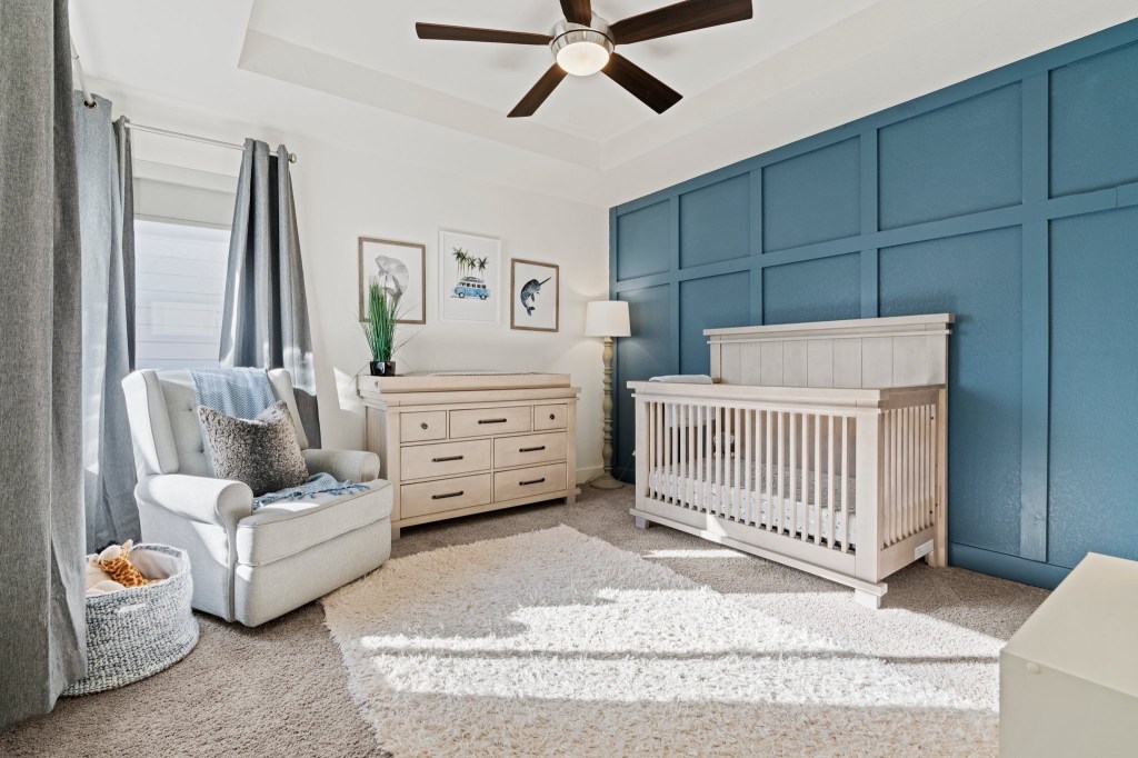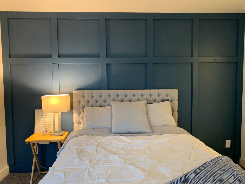 I knew we wanted an accent wall. I picked the color from Home Depot that was a dark blue with a hint of green.