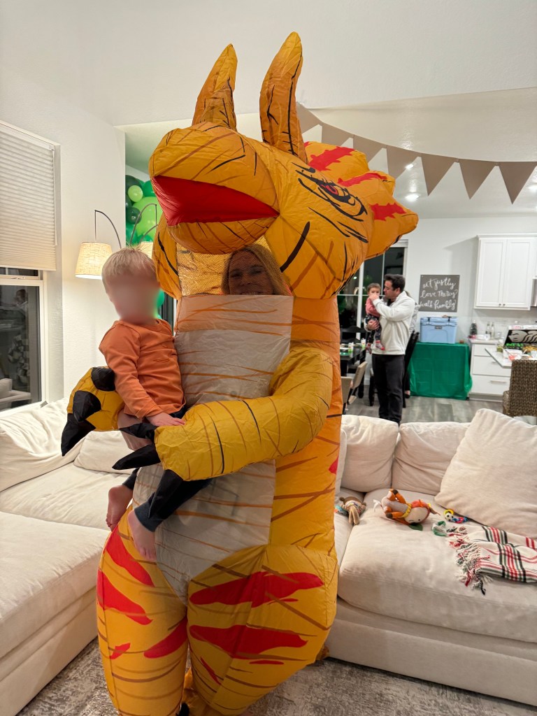 I think I was probably the most excited to wear the new dino suit and scare (I mean entertain) all the kids. This was such a fun surprise! The dino suit I bought is currently out of stock, so here are a couple similar ones! They make some real scary ones, but for a 3 year old party…I went on the “happy dino” side of things.