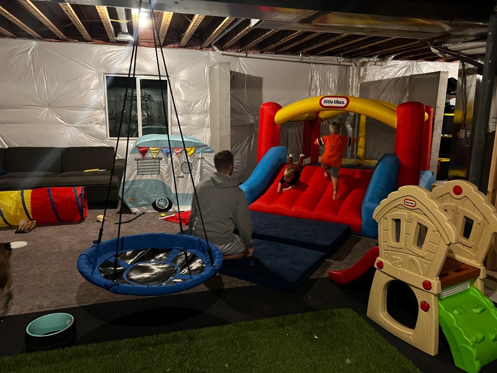 Most of the toys in the basement are hand-me-downs or gifts that didn’t have a place elsewhere in the house, but it’s amazing how much enjoyment they get out of them now. We also moved some outside toys inside for the winter. The biggest hit, though, has been the bounce house—it’s always a crowd-pleaser!