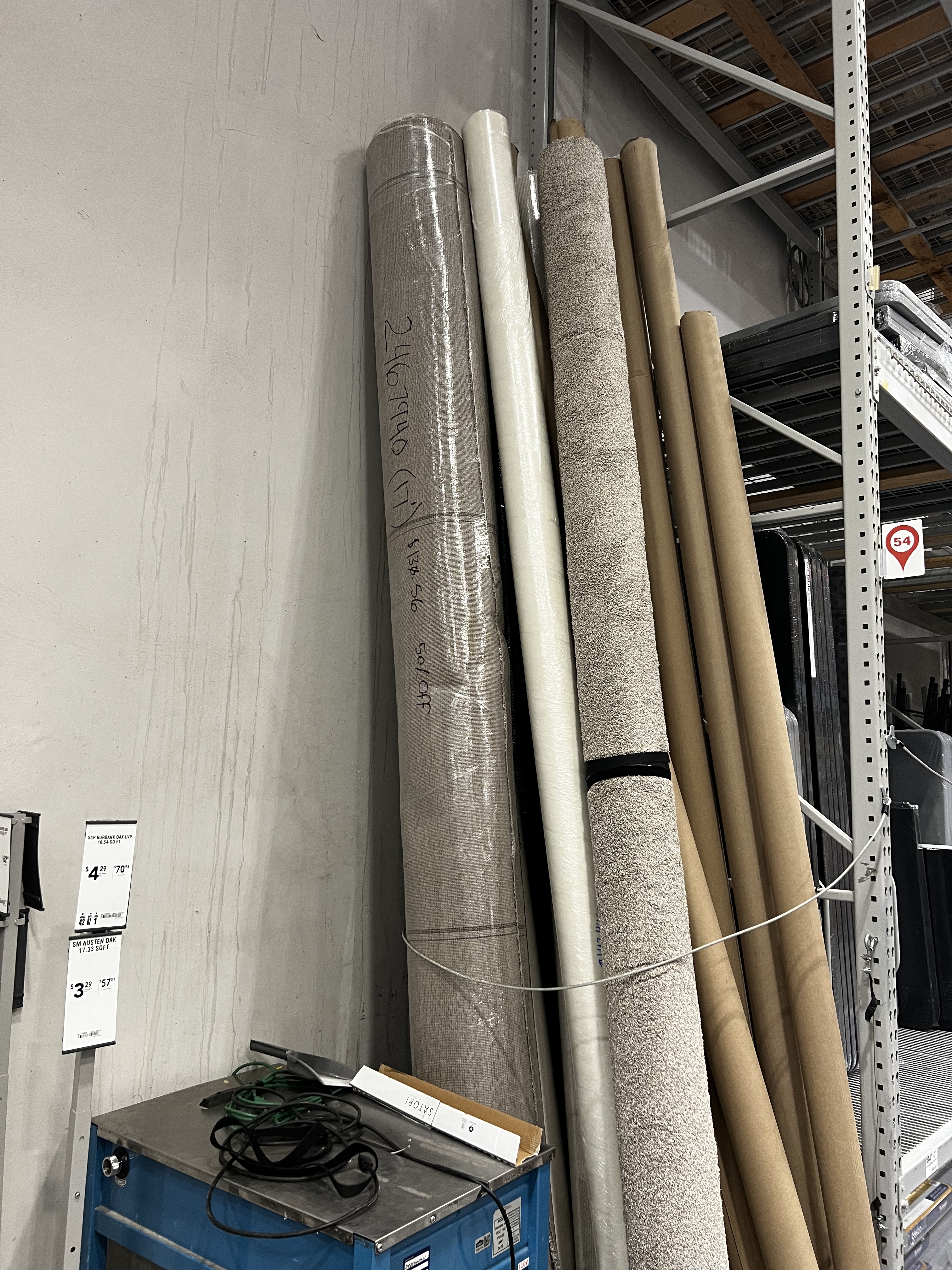 Once the space was cleaned up, I knew I wanted to lay down some carpet for extra padding—especially for crawling and the occasional impromptu gymnastics session. After checking out a few local Home Depots and Lowes, I discovered that they sell remnant carpet pieces at a steep discount if you catch the timing right. I got lucky one day when I spotted a corner of the store with large rolls of carpet. I asked an employee about them, and she told me they were clearing out stock for new shipments—all of it priced at just $20! We rented a truck and hauled home not just the carpet, but also some turf for an outdoor feel, along with a carpet pad to add extra cushion for our new walker.