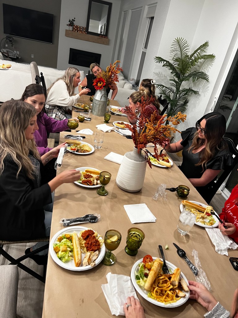 In short, it’s a themed girls’ night. Everyone chips in ($25-$35) to cover the cost of food and craft supplies. For the food, I like to keep it low-stress—because let’s be honest, moms just want to enjoy a meal & not have to worry about cleanup (even the host). I usually order Olive Garden because, well, it’s delicious. No need to stress over a fancy meal when all you want to do is unwind. My motto: there’s a time and place to get fancy, but if I’m not up till 2 a.m. scrubbing dishes, I’m happy. So we go for disposable plates and a catered dinner.