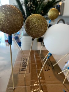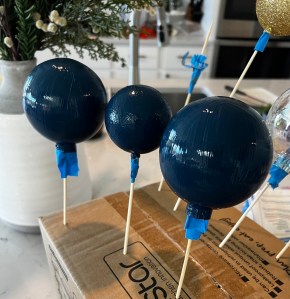 Grab any ornaments you have lying around—old ones you no longer love, or a pack of new ones from the store (preferably with a mix of sizes). The variety in size makes for more interesting results! Take the caps off the ornaments and carefully attach them to skewers. Secure each ornament in place with a bit of painter’s tape to prevent wobbling. Trust me, you’ll want them to stay still while you paint!