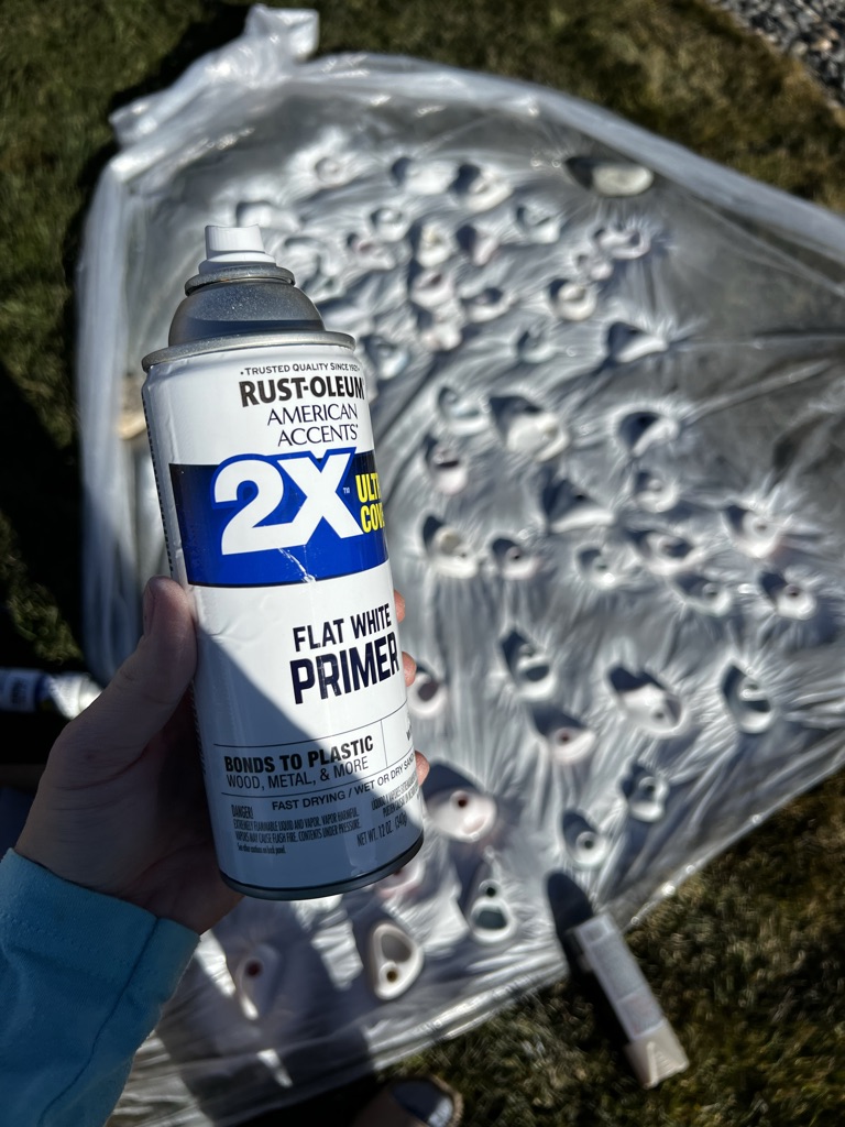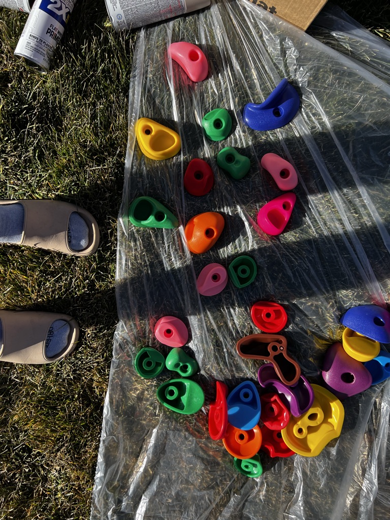 To match our basement’s vibe, I spray-painted the holds. First, I used Rust-Oleum primer, followed by a tan spray paint I liked. This step is optional, but it helped everything look more cohesive.