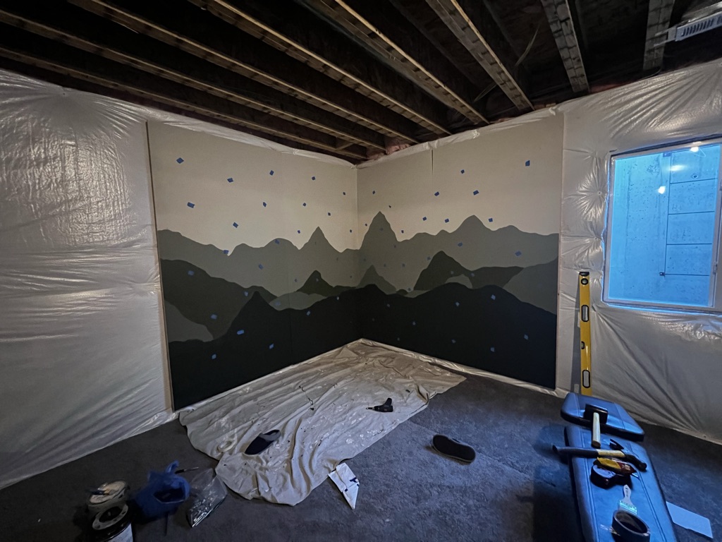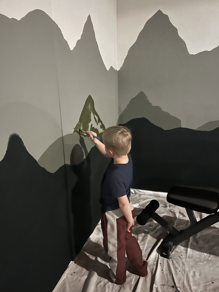 I used leftover paint samples to create a mountain-themed mural. It’s in the basement, so I didn’t stress too much—just freehanded the design and even let our 4-year-old help. It made the project even more special!