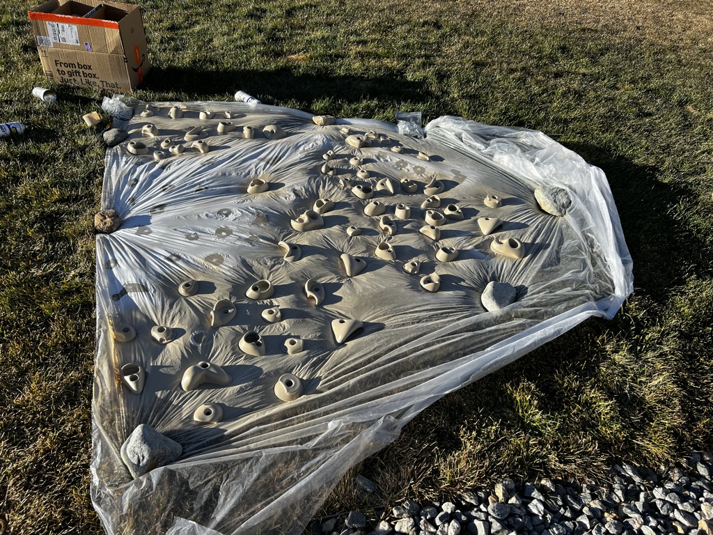 I ordered a pack of 32 climbing holds from Amazon (we used two packs for a total of 64). They came with all the hardware needed for installation and were easy to organize and prep.