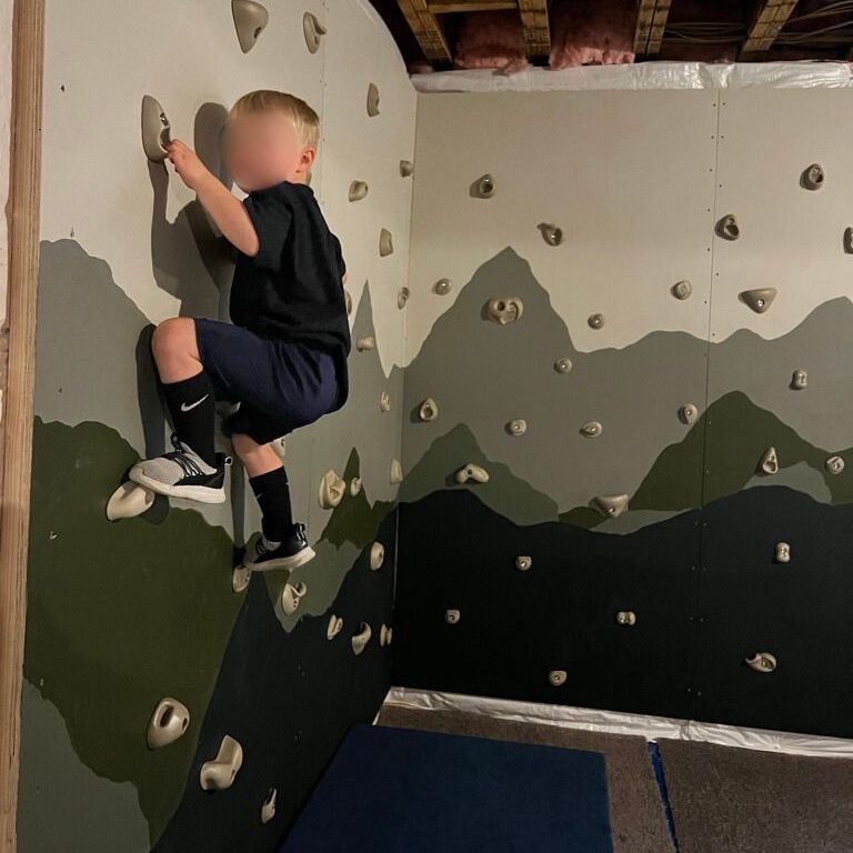 This year for Christmas I decided to gift the boys a rock climbing area. It was a really fun project and perfect for our unfinished basement. I’ll show you how I made this cost effective climbing wall.