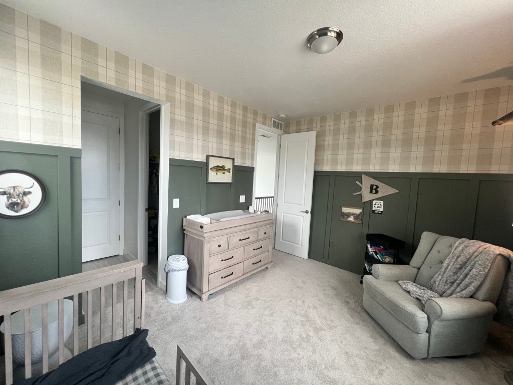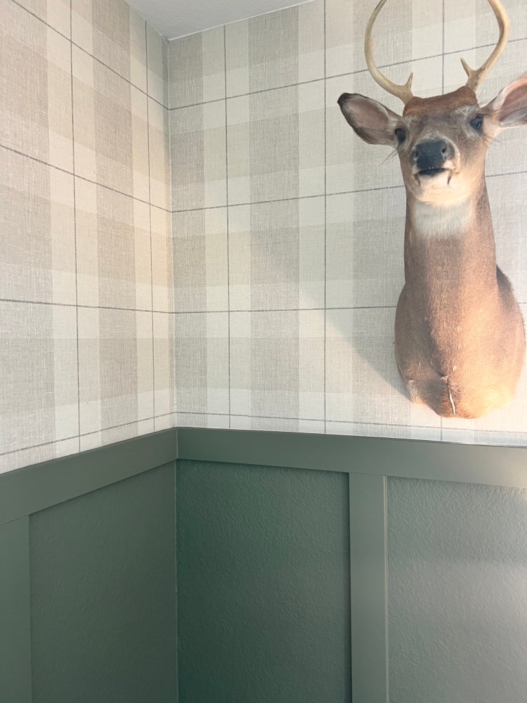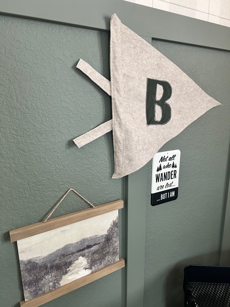 Once the walls were done, it was time for the fun part: decorating. I let our little guy help choose a few things. (I was rooting for the grizzly bear art, but he went with the fish. 🐟) Most of the room accents are from Hobby Lobby, except for the deer, Phil, who is basically part of the family now and watches over us.